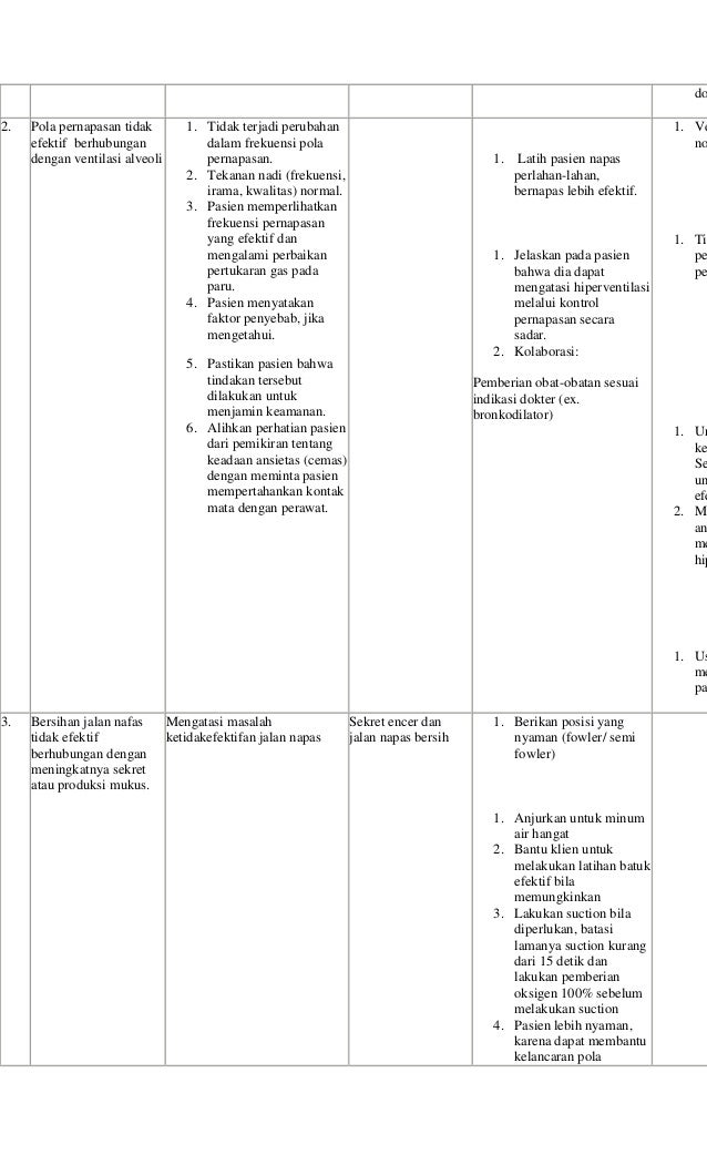 Cek analisa gas darah setiap 10 30 mnt. Ketidakefektifan pola nafas berhubungan pemasangan yang tidak tepat peningkatan sekresi. M dengan masalah utama ketidakefektifan bersihan jalan nafas pada sistem pernafasan di instalasi gawat darurat di rs pku muhammadiyah gombong.