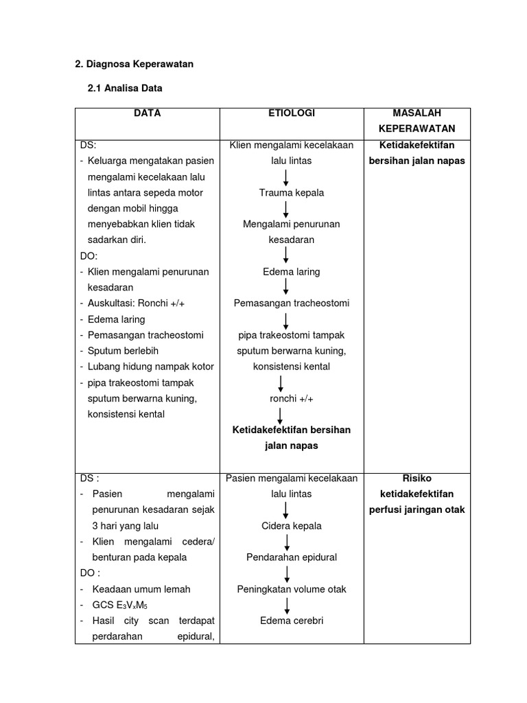 Analisa data ketidakefektifan bersihan jalan nafas. Terdapat benda asing dijalan napas spasme jalan napas. Infeksi disfungsi neuromuskular hiperplasia dinding bronkus alergi jalan nafas asma trauma obstruksi jalan nafas. Penulis mampu merumuskan diagnosa keperawatan ang dengan ketidakefektifan bersihan jalan nafas pada pasien bronkitis.