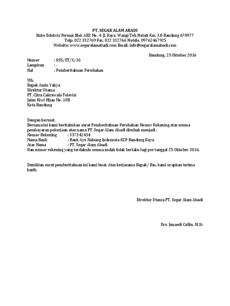 Contoh Surat Pemberitahuan Perubahan Nomor Rekening Bank