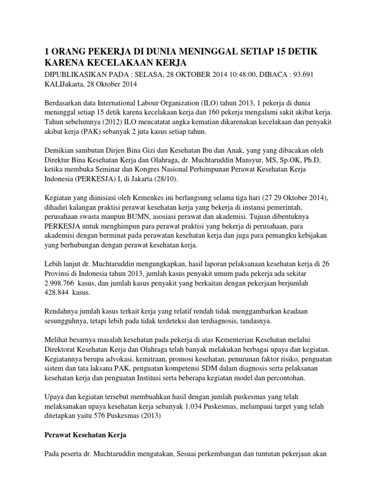 1 Orang Pekerja Di Dunia Meninggal Setiap 15 Detik Karena