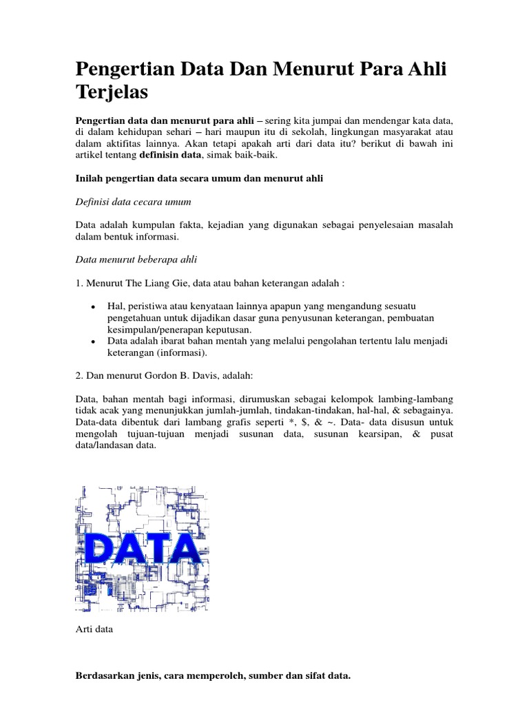Definisipengertian data menurut para ahli berkisar tentang. Pengertian data menurut para ahli. Berikut ini pelajaransekolahonlinecom akan memberikan beberapa definisi data menurut pendapat para ahli.