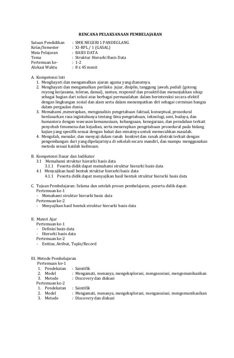 Mulai dari struktur basis data struktur hirarki basis data materi entitas dan atribut arsitektur aplikasi dari basis data hingga cara melakukan modifikasi basis data. Berikut ini penulis share contoh model rpp basis data smk kelas xi yang dalam pembelajarannya terdapat langkah pembelajaran untuk penguatan karakter atau istilah familiarnya adalah ppk pendidikan penguatan karakter. Materi basis data ditingkat smk untuk kelas xi xii cukup lengkap.