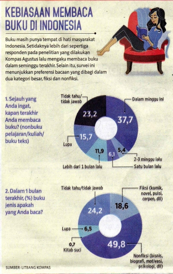 Dari data perpustakaan nasional tahun 2017 frekuensi membaca orang indonesia rata rata hanya tiga sampai empat kali per minggu. Berdasarkan survei unesco minat baca masyarakat indonesia baru 0001 persen. Sementara jumlah buku yang dibaca rata rata hanya lima hingga sembilan buku per tahun.