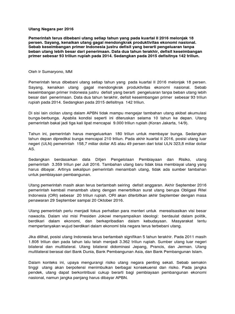 Data utang indonesia 5 tahun terakhir. Perekonomian indonesia pada tahun 2011 menunjukan daya tahan yang kuat di tengah meningkatnya ketidakpastian ekonomi global. Kontribusi terbesar yaitu dari utang luar negeri pemerintah. Rasio beban bunga utang terhadap total pendapatan dan hibah indonesia pada tahun 2015 berada pada tingkat 99 relatif lebih baik dibandingkan negara setara seperti meksiko.