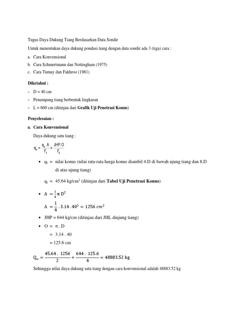 L n n1 n 0 418 n qu q p q s 419 qu qa 420 3 dengan k koefisien tanah dapat dilihat dari table dibawah. Uji sondir lebih dari sekedar syarat pengurusan imb ijin mendirikan bangunan saja tapi lebih dari itu uji sondir adalah alat keselamatan anda dan. Daya dukung tiang pancang dapat didukung dengan perhitungan yaitu menganggap perlawanan terhadap ujung tiang dengan tanah adalah sama dengan nilai sondir yaitu nilai perlawanan penetrasi konus ppk dan jumlah hambatan lekat jhl.