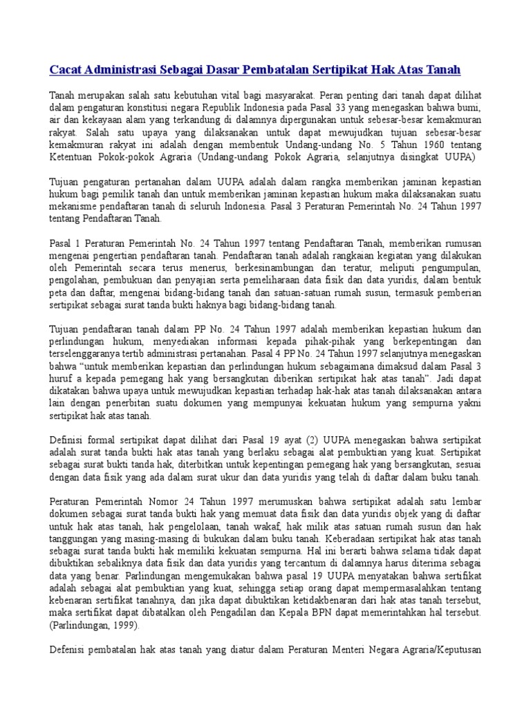 Cacat Administrasi Sebagai Dasar Pembatalan Sertipikat Hak