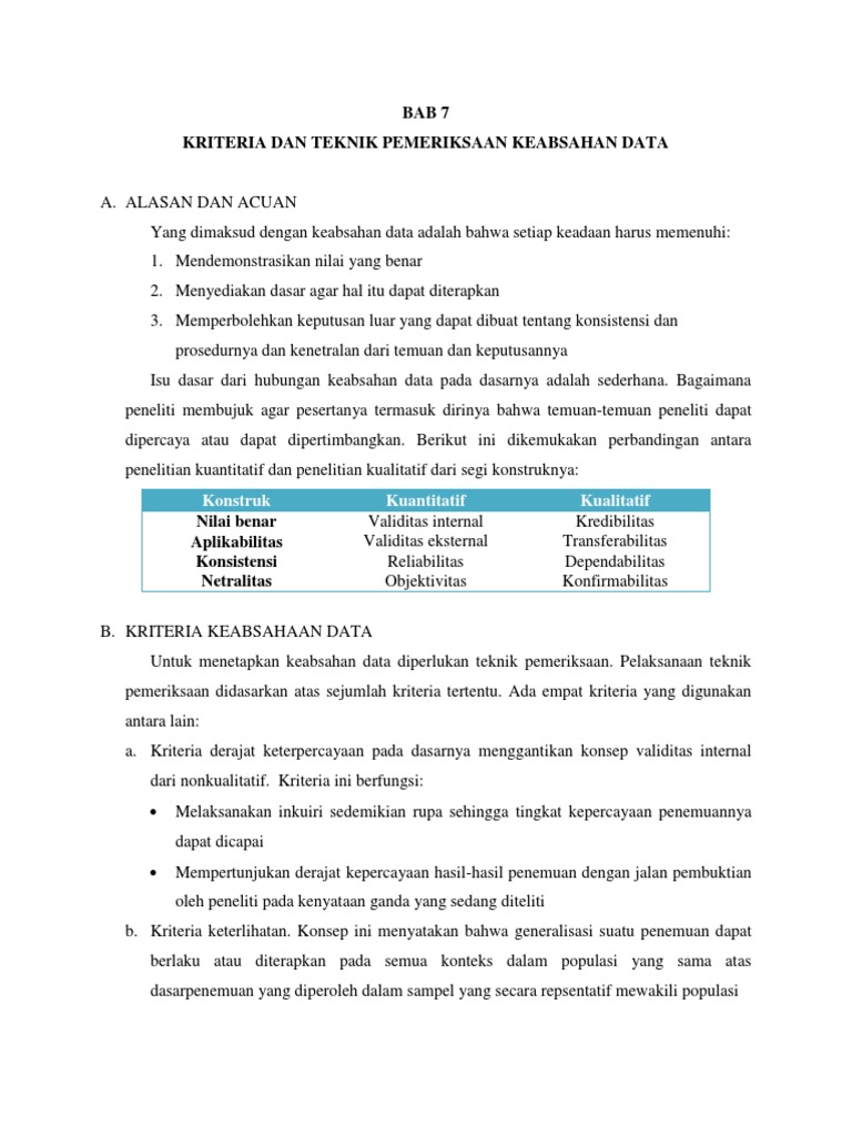 Rencana pengujian keabsahan data penelitian kualitatif. Ada beberapa faktor yang mempengaruhi keabsahan data penelitian kualitatif yaitu. Pada dasarnya uji keabsahan data dalam sebuah penelitian hanya di tekankan pada uji validitas dan reliabilitas. Banyak hasil penelitian yang diragukan kebenarannya karena beberapa hal yaitu subjektivitas peneliti merupakan hal yang dominan dalam penelitian kualitatif alat penelitian yang diandalkan adalah wawancara dan observasi mengandung banyak kelemahan ketika dilakukan secara terbuka dan apalagi tanpa kontrol dan sumber data kualitatif yang kurang credible akan mempengaruhi hasil akurasi penelitian.