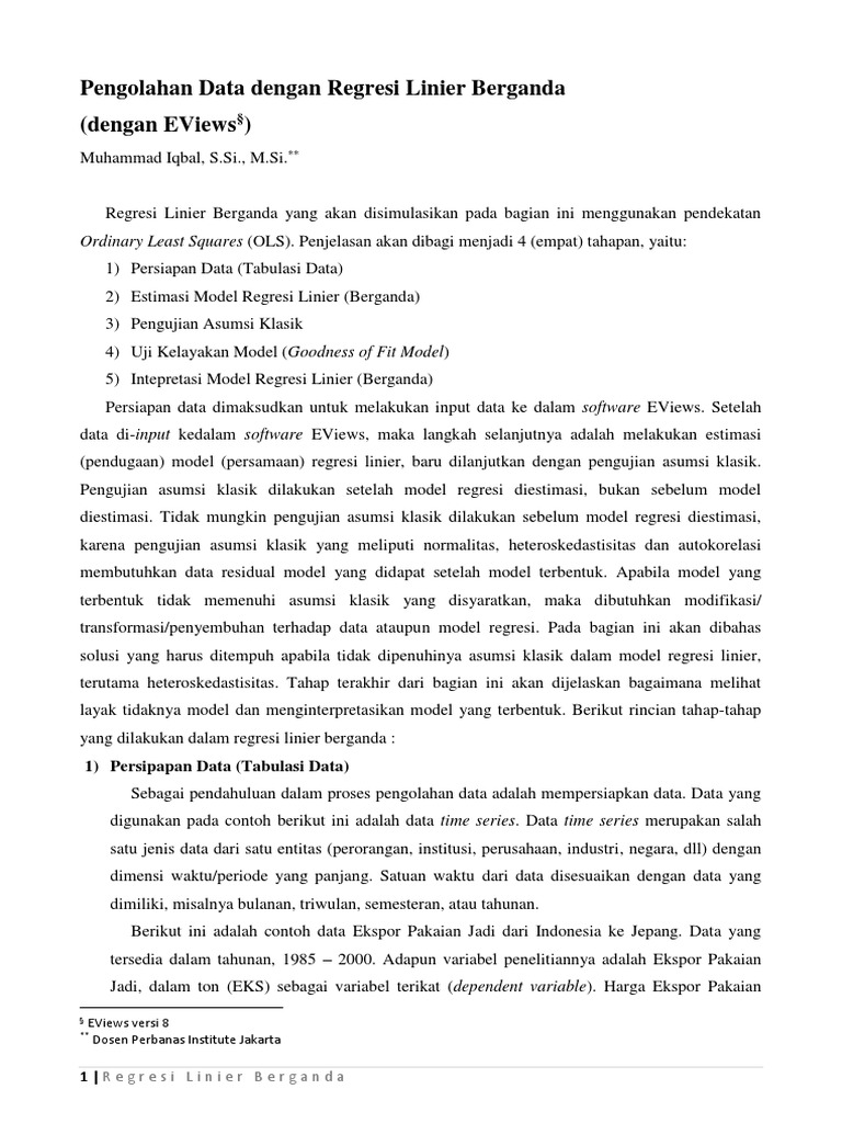 Pengolahan Data Dengan Regresi Linier Berganda Dengan Eviews