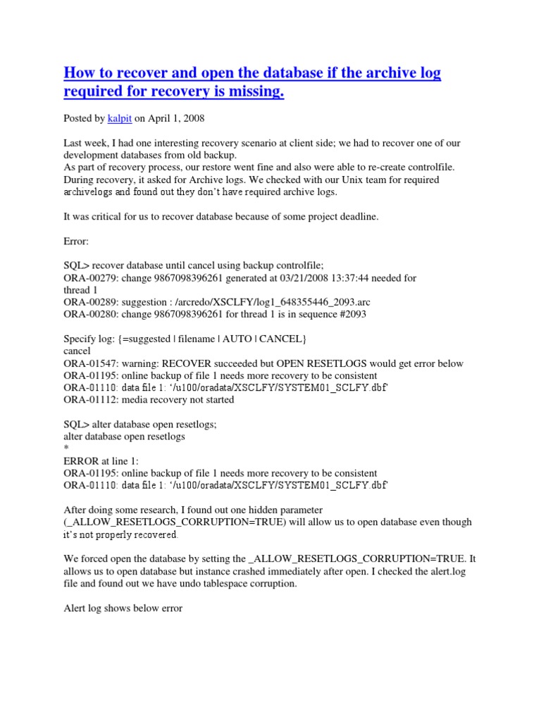 Ora 01194 File 1 Needs More Recovery To Be Consistent